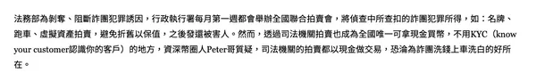 他進一步質疑,司法機關拍賣加密貨幣的流程,成為全國唯一可拿現金買幣,不用 KYC(Know Your Customer,企業確認客戶身份的程序)的地方,會不會成為詐團洗錢的最佳場所?