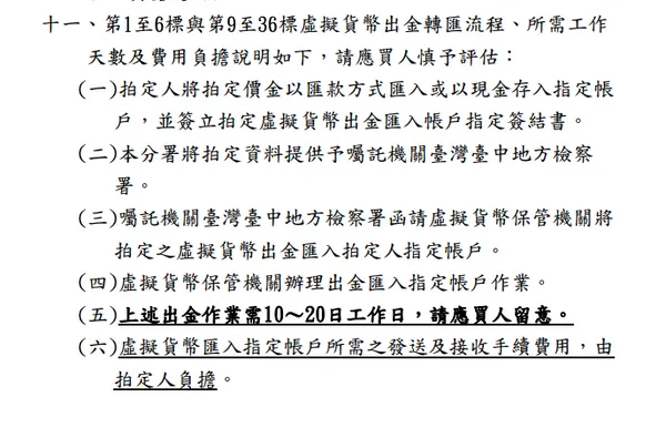 - 囑託機關臺灣臺中地方檢察署函請虛擬貨幣保管機關,將拍定之加密貨幣出金匯入拍定人指定帳戶。