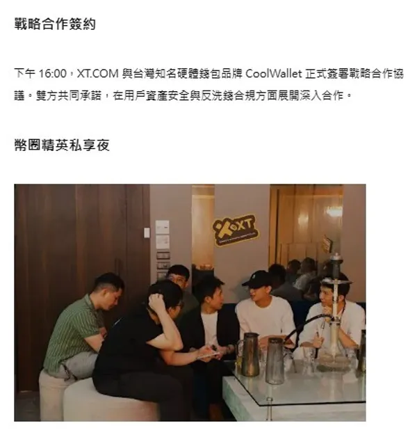 這場風波的起點,是XT.com發布的新聞稿。稿中詳述了在北投麗禧溫泉酒店舉行的首屆合作夥伴說明會暨簽約儀式,並特別強調下午4點與CoolWallet的正式合作協議簽署。XT.com在新聞稿中聲稱,雙方將在用戶資產安全與反洗錢合規方面展開深入合作,甚至展望未來將持續深化此一合作,優化硬體錢包支援下的安全架構。