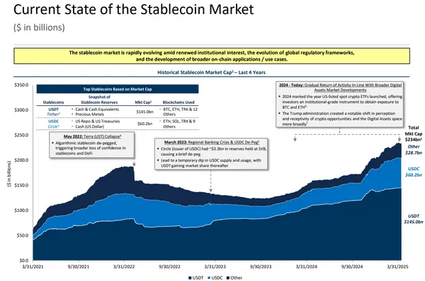 穩定幣市場近年來經歷了顯著的波動與發展。截至2025年4月14日,整個市場的總市值已達到2340億美元,其中USDT(Tether)以1450億美元的規模占據主導地位,而USDC(Circle)則以602億美元緊隨其後,其他穩定幣的總市值為287億美元。