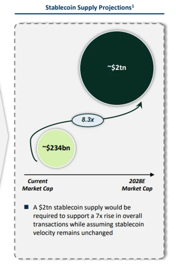 預計到 2028 年,穩定幣市場規模將從當前的 2340 億美元增長至 2 萬億美元。這一增長需要交易量顯著提升,並假設穩定幣的流通速度保持不變。