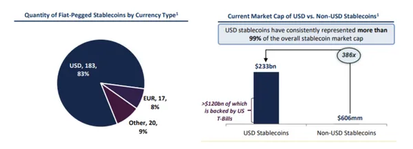 穩定幣市場主要由美元錨定的穩定幣組成,這使得近期的重點集中在潛在的美國監管框架及其立法對穩定幣增長的加速影響上。