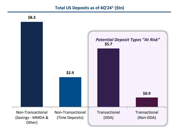 截至 2024 年第四季度,美國的總存款規模達到 17.8 萬億美元,其中非交易型存款(包括儲蓄帳戶和定期存款)占據主要部分,分別為 8.3 萬億美元 和 2.9 萬億美元。交易型存款則包括活期存款(5.7 萬億美元)和其他非活期交易存款(0.9 萬億美元)。