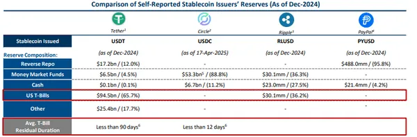 國債需求的整體增加,穩定幣立法中的儲備要求將為國債提供額外且不斷增長的需求來源;國債持有期限的整體前移,立法要求穩定幣發行者持有期限小於93天的國庫券,導緻國債持有集中於短期。