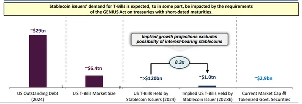 美國《GENIUS 法案》對短期國債的要求可能進一步推動穩定幣發行方對 T-Bills 的配置。