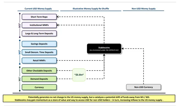 穩定幣的增長可能不會直接改變美國貨幣供應的總量,但會導緻資金從 M1 和 M2 中轉移。這種轉移可能會影響銀行的流動性和傳統存款的吸引力。
