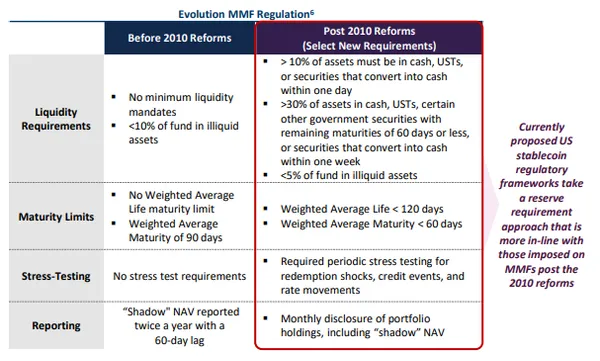 美國當前提出的穩定幣監管框架與 2010 年後 MMF 的改革要求類似,重點包括: