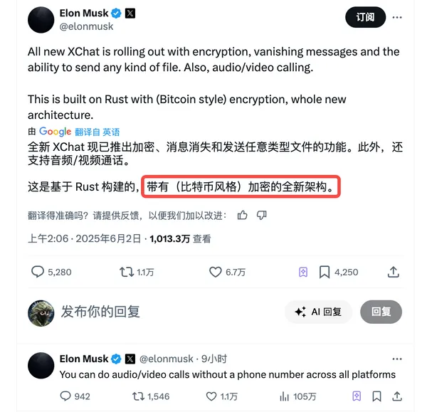 不過更吸引目光的是,馬斯克宣稱XChat採用了「比特幣風格的加密」,並用Rust語言開發,號稱「全新架構」。