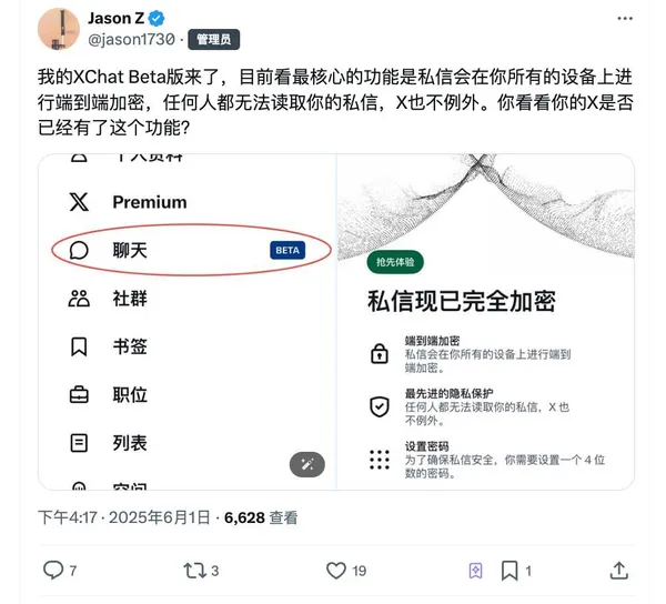 據某些推友回饋,自己的 X 帳號當前已經被推送了 Xchat,並標記為「Beta」測試版,最核心的功能是私信會在你所有的設備上進行端到端加密,任何人都無法讀取你的私信,X也不例外。