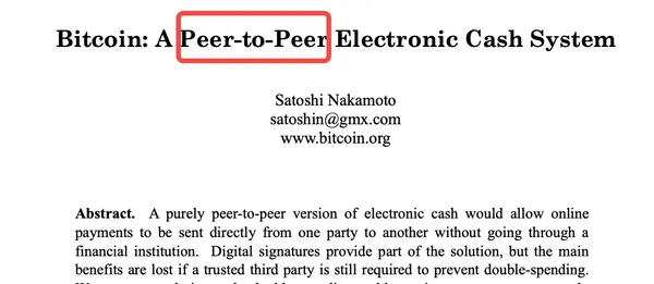 其實十多年前的比特幣白皮書標題已經說的很清楚了,「點對點的現金支付系統」,這裡的點對點也即經常聽到的P2P。