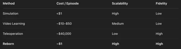 - 真實世界數據:雖然準確,但需要遠端操控和人力閉環操作,這導致成本高昂(每台機器人4萬美元以上)且缺乏可擴展性。