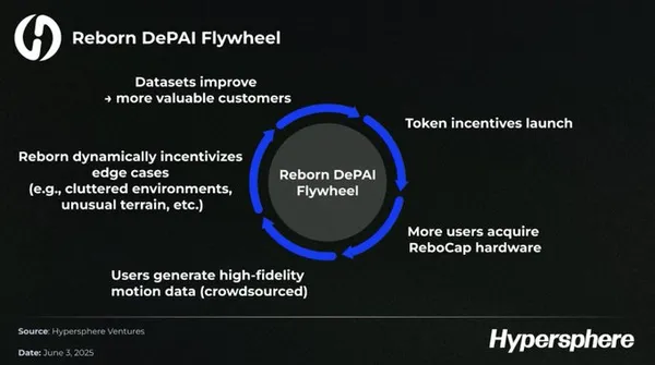 Reborn至今尚未發行代幣,其業務的有機增長更顯難能可貴。當代幣激勵機制正式啟動,網路參與度將作為DePAI飛輪效應的關鍵環節加速提升:用戶購買Reborn硬體設備(ReboCap採集儀)可獲得項目方激勵,機器人研發公司則向ReboCap持有者支付貢獻獎勵,這種雙重激勵將推動更多人購置並使用ReboCap設備。同時項目方將動態激勵具有高價值的訂製化行為數據採集,從而更有效地彌合模擬模擬與現實應用(Sim2Real)間的技術鴻溝。