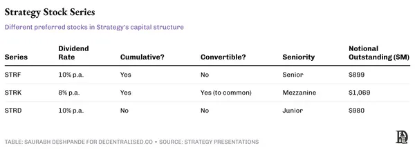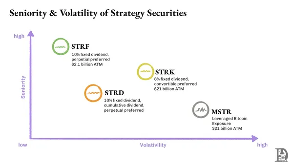在這一結構的核心是三種不同的永久優先股系列:STRF、STRK 和 STRD,每種都針對不同的投資者類型量身訂製。