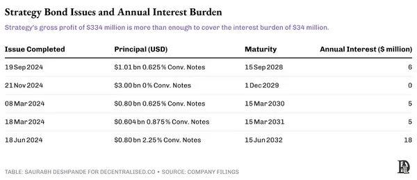 但這種風險有多大呢?MicroStrategy 的年度利息負擔總計為 3,400 萬美元,而 2024 財年的毛利潤為 3.34 億美元,足以償還債務。MicroStrategy 發行了與比特幣四年週期相關的可轉換債券,其到期時間足夠長,以減輕價格下跌風險。因此,只要比特幣在四年內上漲超過 30%,新股票發行就可以輕鬆支付贖回費用。