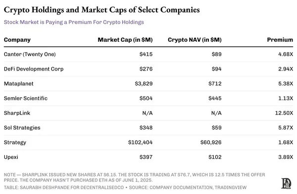 在今天的文章中,Saurabh 詳細解讀了企業如何透過向資產負債表中添加加密貨幣來實現其實際價值的溢價。以 MicroStrategy 為例,這家公司季度營收僅略高於 1 億美元,卻持有價值近 109 億美元的比特幣。全球已有 80 家企業探索如何將加密貨幣納入其資產負債表。傳統金融機構對此表現出極大的興趣,並為這種股票的波動性和潛在收益支付了溢價。
