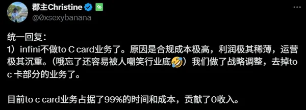 6月17日,Infini 聯創郡主 Christine 在 X 上發文,宣布停止面向消費者的加密U卡業務,同時也詳細闡述了背後的原因: