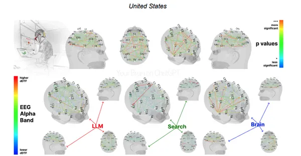 麻省理工的研究結果顯示,「純大腦組」展現了最強且分佈最廣泛的神經網路連結,而「Google 搜尋組」顯示中等程度的認知參與,至於「ChatGPT 組」則表現出最弱的整體耦合。