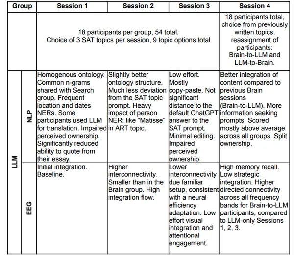 參與者被分為三組:全程使用 ChatGPT 輔助的「ChatGPT 組」、僅能使用傳統搜尋引擎的「Google 搜尋組」,以及完全不使用任何工具,只靠自身思考與寫作的「純大腦組」。