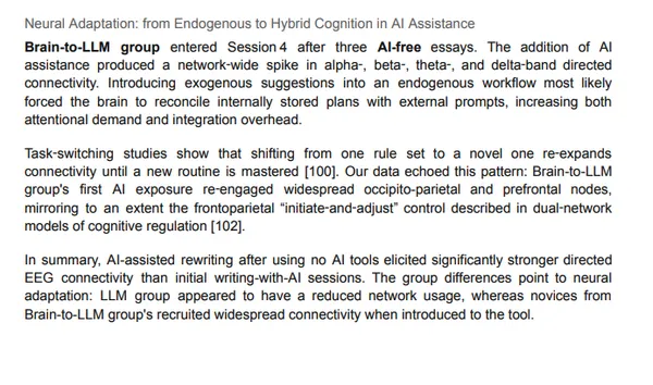研究中的第四階段實驗顯示,那些先獨立完成初稿,再利用 ChatGPT 進行潤飾和編輯的參與者,其大腦連結性反而呈現增強的趨勢。