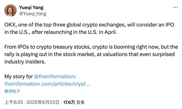 6月23日,據The Information加密記者Yueqi Yang披露,OKX在今年4月重返美國市場後,正考慮在美國進行IPO。