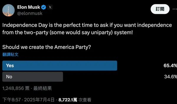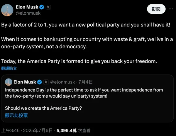 全球首富伊隆.馬斯克(Elon Musk)在 7 月 6 日透過其社群媒體平台 X 宣佈成立新政黨「美國黨」(America Party),此舉象徵著他與美國總統唐納德.川普(Donald Trump)關係的徹底決裂。馬斯克在貼文中表示:「今天,美國黨成立了,要把自由還給你們。」
