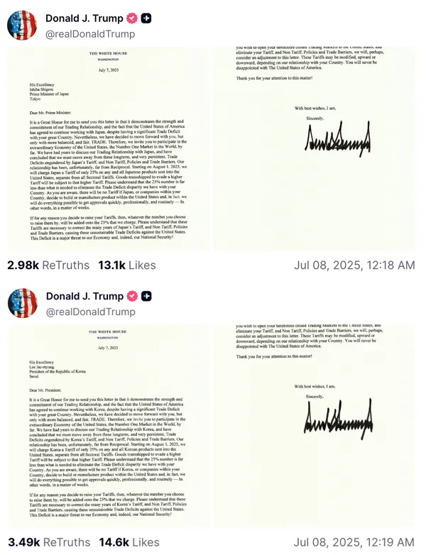 美國總統川普週一在 Truth Social 平台上發佈兩封信函(信函一、信函二),宣佈將對日本和南韓課徵 25% 的關稅,重新點燃市場對貿易戰的擔憂。川普在信中指出,美國與這兩個國家的貿易一直不公平,導致美國出現貿易逆差。這項關稅政策將於 8 月 1 日生效,比原定的 7 月 9 日截止期限延後。