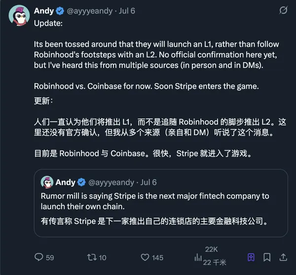儘管除了內部人士外無人確切知道 Stripe 是否會推出 L1,但考慮到近期傳統美國金融圈對區塊鏈和穩定幣行業的興趣激增,以及卡網路公司(如 Visa 和 Mastercard)不斷增加區塊鏈整合的舉措,再加上 Robinhood 宣布計劃通過 Arbitrum 對股票進行代幣化,這些因素使得圍繞 Stripe 推出 L1 的傳聞迅速吸引了社區的關注。