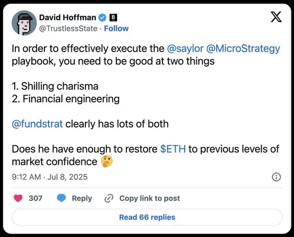 Tom Lee 的 Bitmine 資金管理策略,正利用以太坊的敘事優勢。策略很簡單:把 ETH 納入資產負債表,然後把 ETH 推銷給華爾街。以太坊本身就有很多敘事亮點,ETH 需要的只是一個足夠有活力、能讓華爾街興奮的人。