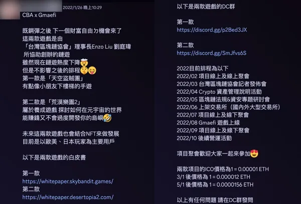 隨後,劉庭瑋更舉辦投資說明會,推銷綁定「天空盜賊團」、「荒漠樂園 2」等網路遊戲的 SBC 幣、DTT 幣。《加密城市》主編 Max 也曾收到該團隊提供的宣傳文案,表示兩款遊戲會在 2022 年 6 月上架國內外大型交易所,但最終連同後續排程規劃的,遊戲上線、線上線下聚會,以及各項承諾的活動都未能兌現。