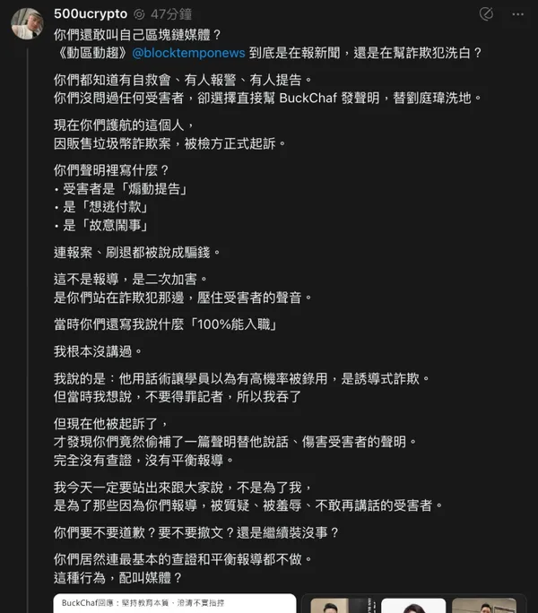 值得注意的是,在劉庭瑋被正式起訴後,有網友在社群媒體上質疑部分區塊鏈媒體先前的報導立場。網友指出,某些媒體在報導 CBA 學院爭議時,選擇直接刊登 BuckChaf 公司的聲明,內容將受害者描述為「煽動提告」、「想逃付款」、「故意鬧事」,甚至將報案、刷退都說成騙錢行為。