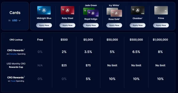 - 豐富的獎勵與回饋: 部分高階卡別提供高達5%的消費回饋,甚至還有Spotify、Netflix、機場貴賓室等福利(但需質押一定數量的CRO幣)。