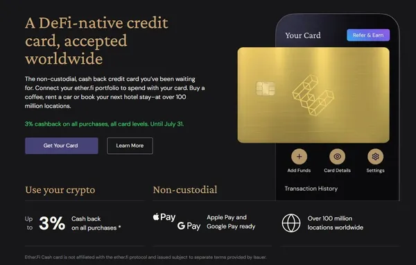 Ether.fi是以太坊上的流動性質押和再質押協議,他們推出的支付卡主打將DeFi收益與日常消費結合,並強調非託管特性。