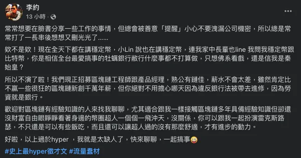 李約特別歡迎熟悉公鏈領域的人才,並開玩笑地表示這兩個職缺適合跟他一樣接觸區塊鏈多年,具備相關經驗知識,卻還沒有財富自由的從業者。
