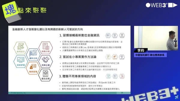 他建議想朝向該領域發展的新鮮人,可以嘗試接觸最新數位金融資訊、嘗試在小專案實作方法論,以及體驗不同專業領域的內容。
