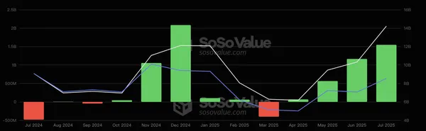 根據SoSoValue數據,自以太坊現貨ETF上線(2024年7月23日)以來,累計淨流入資金約為57.6億美元,佔以太坊總市值的3.87%。從資金流動節奏看,在過去13個月中,僅有三個月出現淨流出,流出金額累計為9.3億美元,整體呈現穩健的資金吸納態勢。