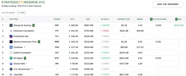 從現階段進場以太坊的機構構成來看,主要分為兩個陣營,一派是以SharpLink為代表,背靠ConsenSys、Galaxy Digital、Pantera Capital、Electric Capital等以太坊支持者,被認為是以太坊生態早期原生勢力的抱團自救。截至目前,SharpLink已累計持有超28萬枚ETH,超越以太坊基金會持有的24.25萬枚,躍升為全球最大ETH機構持有者。