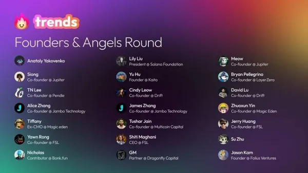 Trends.fun 的創辦人 Mable Jiang 先前曾是明星項目 STEPN 的營收長、頂尖創投機構 Multicoin Capital 合夥人以及 DiDi 企業策略經理。同時 Mable 也被公認是 Solana 社群中的重要人物之一,在社群內和亞洲區塊鏈投資圈擁有廣泛的人脈和影響力,這次 Trends.fun 項目中她也拉動了多個 Solana 生態系中的重要人物來支持。