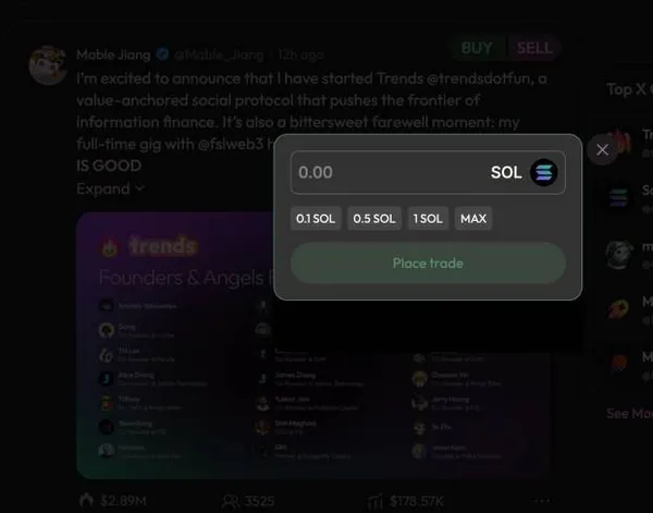 在首頁的每條貼文旁邊都有 BUY 和 SELL 選項,使用者一鍵即可參與該條推文代幣的買賣。