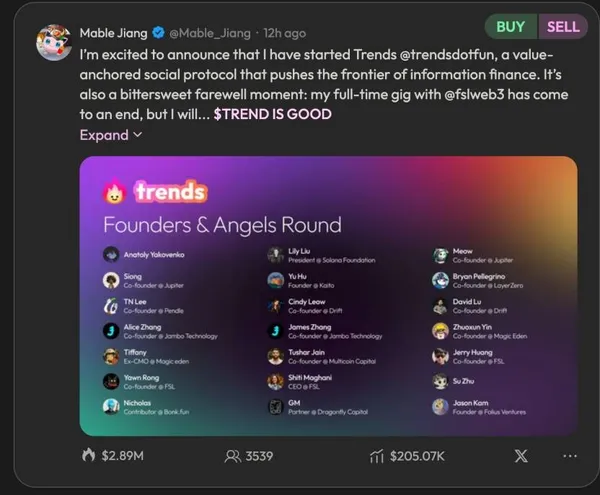 創辦人 Mable Jiang 介紹 Trends.fun 項目背景推文(代幣持有人數 3539,市值 205K)