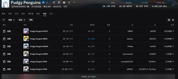 Pudgy Penguins 「地板價」16.75 ETH(約 6.36 萬美元),24 小時上漲 16.5%,24 小時「交易額」1698 ETH(約 643 萬美元)。