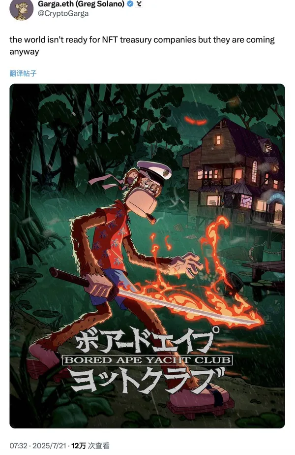 就在 7 月 21 日,YugaLabs 共同創辦人 Greg Solano 發布一條推文,暗示將 NFT 列為戰略儲備資產的公司即將到來。