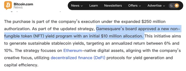 而在今日,美股上市公司 GameSquare Holding 宣布將其加密資產管理資金從 1 億美元提升至 2.5 億美元,並新增一項 ETH 生態內 NFT 收益策略,初步配置 1000 萬美元,目標年化收益為 6%-10%。