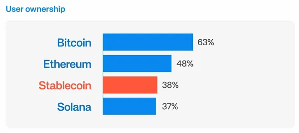 除了常見的支付和交易活動,這份調查也揭示了加密貨幣持有現況的重要趨勢。數據顯示,63%的受訪者擁有比特幣(BTC),而48%則持有以太幣(ETH),這兩大主流加密貨幣的地位依然穩固。值得注意的是,穩定幣的持有率已躍升至38%,首次超越了Solana(SOL)的37%,顯示其在用戶資產配置中的重要性日益提升。