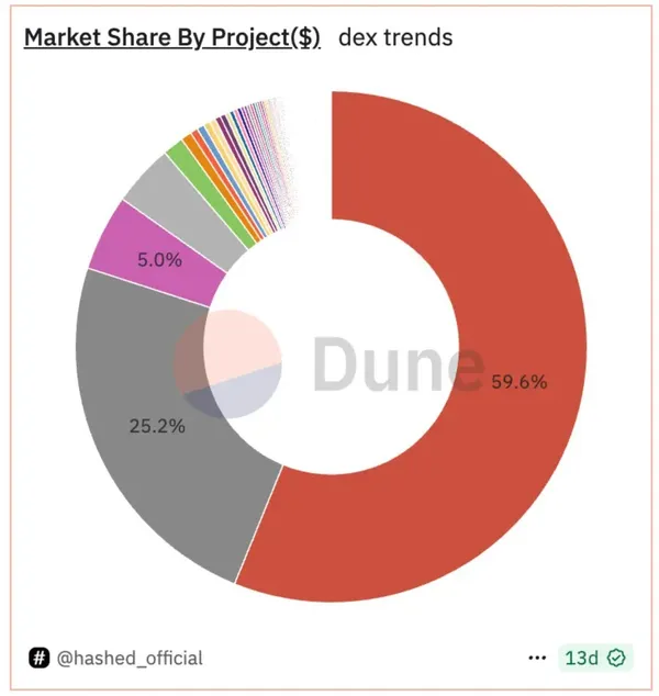 在幣安Alpha的流量推動下,PancakeSwap完成了史詩級躍遷,成為BNB Chain最核心的增長引擎。數據顯示,PancakeSwap在全鏈DEX市場中的份額高達59.6%,市場份額佔據全鏈DEX的近五分之三。PancakeSwap的成功並非偶然。它在2-3月承接Alpha專案首發流量,實現第一波爆發;隨後在6月推出跨鏈兌換功能,並於7月正式整合Solana,徹底打破了單鏈束縛。
