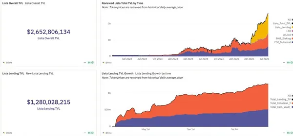 如果說Pancake是交易引擎,那麼Lista DAO則是BNB Chain在DeFi領域的第二增長高地。Lista自2024年6月代幣上線後,TVL目前已突破26.52億美元,成為BNB Chain第二大借貸市場。其累計借貸量超過12.8億美元,協議收入穩定。