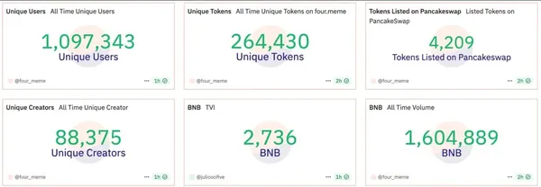 而在這個Meme幣橫行的週期,Four.meme成為BNB Chain引爆鏈上活力的重要引擎。它吸引了約110萬獨立用戶,累計交易量約160.5萬BNB。其成功不僅源於極低的發行門檻,更離不開與CZ「手勢4」文化的深度綁定。從「CZ寵物狗同名幣」到中東祝福幣,每一次社群熱點都能在平台迅速轉化為鏈上狂歡。