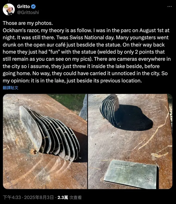 首位發現雕像失蹤的社群使用者 Gritto 在社交媒體上分享了他的目擊經過,聲稱在 8 月 1 日瑞士國慶夜晚看到雕像完好無損,但隨後有一群醉酒人士經過該處。Gritto 推測這群人可能輕易移動了僅靠兩個焊接點固定的雕像,並將其丟入附近的盧加諾湖中。