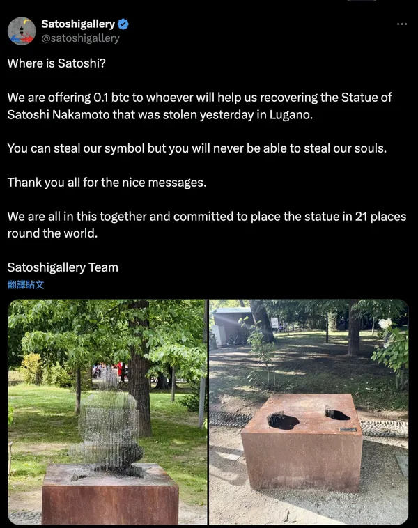 負責安裝雕像的藝術組織 Satoshigallery 隨即宣佈提供 0.1 枚比特幣(價值約 11,359 美元)的懸賞金,尋求任何能協助找回雕像的資訊。Tether 執行長 Paolo Ardoino 也對此事件表達關切,確認有不明人士移除了雕像。
