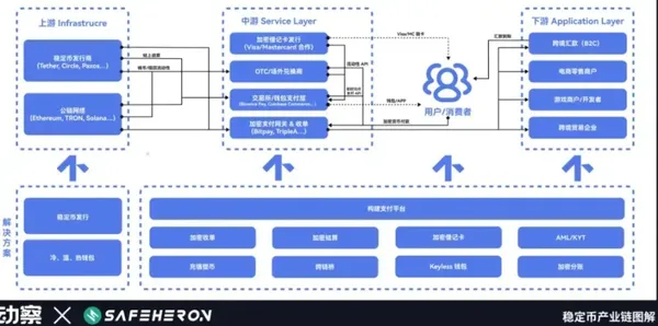 在洞察 Beating 聯合數位資產自托管服務商 Safeheron 發布的穩定幣產業鏈圖解中,穩定幣發行只是整個鏈條的起點,而要想穩定幣能夠流通,則需要將目光投向中下游。