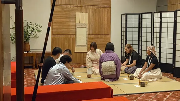 緊鄰舒壓按摩區的,則是一方靜謐的「日式茶道體驗」空間。身著和服的茶道師優雅地為參觀者奉上一杯杯抹茶,讓人在靜謐的氛圍中,感受日式美學與禪意。